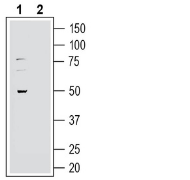 Western blot analysis of human U-87 MG glioblastoma cell line lysate:1. Anti-GPR37L1 (extracellular) Antibody (#AGR-050), (1:200). 2. Anti-GPR37L1 (extracellular) Antibody, preincubated with GPR37L1 (extracellular) Blocking Peptide (BLP-GR050).