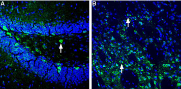 Expression of Homer1 in mouse hippocampus and striatumImmunohistochemical staining of perfusion-fixed frozen mouse brain sections using Anti-Homer1 Antibody (#APZ-026), (1:400), followed by goat-anti-rabbit-AlexaFluor-488 secondary antibody. A. Homer1 staining (green) in hippocampal dentate gyrus region, is detected in neuronal soma (arrows). B. Homer1 staining in the striatum region, also shows labeling in neuronal soma (arrows). Cell nuclei are stained with DAPI (blue).