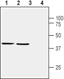 Western blot analysis of mouse brain membranes (lanes 1 and 3) and rat brain synaptosomal fractions (lanes 2 and 4):1,2. Anti-Homer1 Antibody (#APZ-026), (1:500).