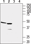 Western blot analysis of human acute monocytic leukemia THP-1 (lanes 1 and 3) and human promyelocytic leukemia HL-60 (lanes 2 and 4) cell line lysates:1, 2. Anti-Human CCR2 (extracellular) Antibody (#ACR-022), (1:1500).