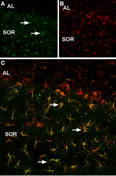 Expression of p75NTR in mouse hippocampusImmunohistochemical staining of mouse frozen hippocampal sections using Anti-p75 NGF Receptor (intracellular) Antibody (#ANT-011) (1:200). A. p75NTR (green) appears in a subset of astrocytes. GFAP (glial fibrillary acidic protein) staining (red) to label astrocytes. C. A merge of the two images shows p75NTR found mainly in stratum radiatum (SOR) and only in a few astrocytes in the alveus (AL).