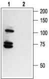 Western blot analysis of rat brain membranes:1. Anti-p75 NGF Receptor (intracellular) Antibody (#ANT-011), (1:200).