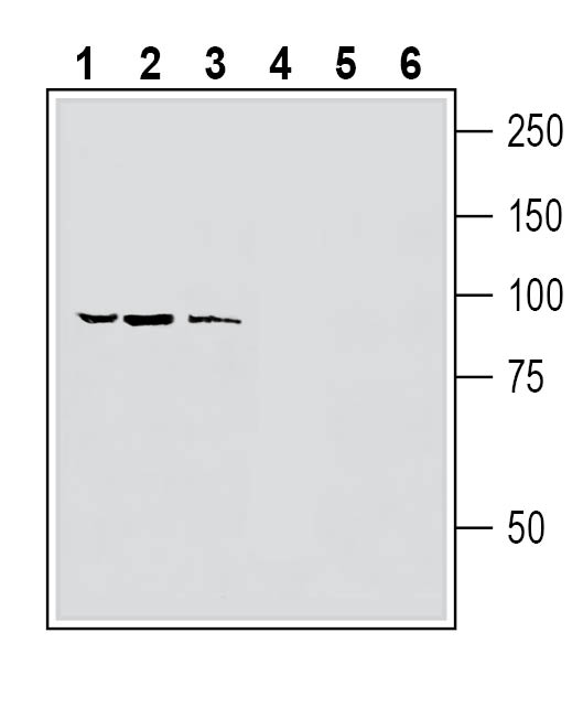 Western blot analysis of human MCF-7 breast adenocarcinoma cell line lysate (lanes 1 and 4), human LNCaP prostate adenocarcinoma cell line lysate (lanes 2 and 5) and human HMC3 microglia cell line lysate (lanes 3 and 6):1-3. Anti-Human TRPV1 (extracellular) Antibody (#ACC-334), (1:500).