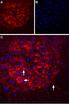Expression of IP3R2 in rat spinal cordImmunohistochemical staining of rat spinal cord using Anti-IP3 Receptor-2 (ITPR2)-ATTO Fluor-594 Antibody (#ACC-116-AR), (1:60). A. IP3R2 immunoreactivity (red) appears in neuronal soma (horizontal arrows) and processes (vertical arrows). B. Nuclear staining using DAPI as the counterstain (blue). C. Merged images of A and B.