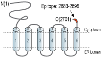 - Peptide (C)RLGFLGSNTPHENH, corresponding to amino acid residues 2683-2696 of rat IP3R2 (Accession P29995). Intracellular, C-terminus.