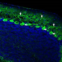 Expression of IQGAP1 in mouse cerebellumImmunohistochemical staining of perfusion-fixed frozen mouse brain sections with Anti-IQGAP1 Antibody (#APZ-055), (1:200), followed by goat anti-rabbit-AlexaFluor-488. IQGAP1 immunoreactivity appears in Purkinje neurons (horizontal arrows) and their dendrites (vertical arrows). Cell nuclei are stained with DAPI (blue).