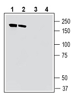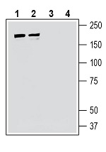 Western blot analysis of mouse brain membranes (lanes 1 and 3) and rat brain membranes (lanes 2 and 4):1, 2. Anti-IQGAP1 Antibody (#APZ-055), (1:200).