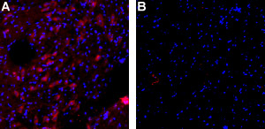 Expression of KCa2.3 (SK3) in rat brainImmunohistochemical staining of rat brain perfusion-fixed frozen sections using Anti-KCNN3 (KCa2.3, SK3) (N-term)-ATTO Fluor-594 Antibody (#APC-025-AR). A. SK3 channel (red) is visualized in the rat substantia nigra pars compacta. B. Pre-incubation of the Anti-KCNN3 (KCa2.3, SK3) (N-term)-ATTO Fluor-594 Antibody with the immunogen peptide, blocks specific staining. DAPI Nissl is used as the counterstain (blue).