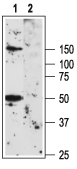 Western blot analysis of rat brain membranes:1. Anti-KV1.3 (KCNA3) (extracellular) Antibody (#APC-101), (1:500).
