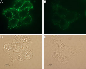 Staining (green) shows expression of KV1.3 in the transfected cells (A) but not in the cells transfected with empty vector (B). Panels C and D show the corresponding live image of the cells.