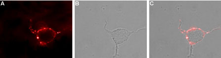 Expression of KV1.4 in live intact rat PC12 cellsCell surface detection of KV1.4 in live intact rat PC12 pheochromocytoma cells. A. Extracellular staining of cells with Anti-KV1.4 (extracellular) Antibody (#APC-167), (1:25), followed by goat anti-rabbit-AlexaFluor-555 secondary antibody (red). B. Live view of the cells. C. Merge of A and B.