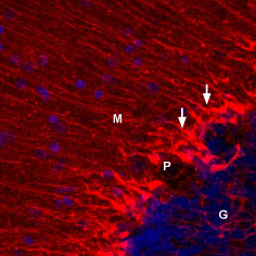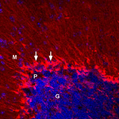 Expression of KV1.5 in mouse cerebellumImmunohistochemical staining of perfusion fixed, free-floating frozen mouse brain sections using Anti-KV1.5 (KCNA5)-ATTO Fluor-550 Antibody (#APC-004-AO), (1:50), (red). Staining was detected in cerebellar Bergmann glial cells (arrows). DAPI is used as the counterstain (blue). G = granule layer, P = Purkinje layer, M = molecular layer.