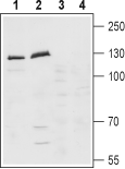 Western blot analysis of rat (lanes 1 and 3) and mouse (lanes 2 and 4) brain lysates:1,2. Anti-Latrophilin-1 (LPHN1) (extracellular) Antibody (#ALR-021), (1:200).