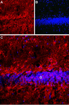Expression of Latrophilin-1 receptor in rat hippocampusImmunohistochemical staining of rat hippocampal dentate granule layer (G) using Anti-Latrophilin-1 (LPHN1) (extracellular) Antibody (#ALR-021). A. Latrophilin-1 receptor staining (red) appears in astrocytes. B. Nuclear staining using DAPI as the counterstain (blue). C. Merged image of A and B.