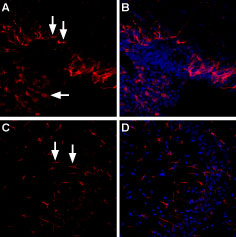 Expression of LPA4 receptor in rat and mouse brainImmunohistochemical staining of rat choroid plexus and mouse hippocampal CA3 region using Anti-LPAR4 (P2Y9) (extracellular) Antibody (#ALR-034), (1:400). A. LPA4 receptor staining (red) in rat choroid plexus appears in astrocytes (vertical arrows) and in cells of the choroid plexus (horizontal arrow). C. LPA4 receptor staining (red) in mouse hippocampal CA3 region is detected in astrocytes (arrows). B, D. Nuclear staining using DAPI as the counterstain (blue).
