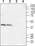 Western blot analysis of rat (lanes 1 and 3) and mouse (lanes 2 and 4) heart membranes:1,2. Anti-LPAR4 (P2Y9) (extracellular) Antibody (#ALR-034), (1:500).