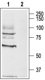 Western blot analysis of rat brain lysate:1. Anti-CHRM3 Antibody (#AMR-006), (1:200).