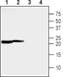 Western blot analysis of rat (lanes 1 and 3) and mouse (lanes 2 and 4) heart lysates:1,2. Anti-MMGT1 Antibody (#ANT-149), (1:400).