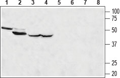 Western blot analysis of rat kidney (lanes 1 and 5), rat skeletal muscle (lanes 2 and 6), rat brain (lanes 3 and 7) and mouse brain (lanes 4 and 8) lysates:1-4. Anti-MCU Antibody (#ACC-328), (1:200).