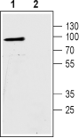 Western blot analysis of human Colo-205 colorectal carcinoma cell lysates:1. Anti-Na+/H+ Exchanger 2 (NHE-2) Antibody (#ANX-002), (1:200).