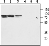 Western blot analysis of rat kidney membranes (lanes 1 and 4), mouse kidney lysates (lanes 2 and 5) and rat stomach lysates (lanes 3 and 6):1-3. Anti-Na+/H+ Exchanger 2 (NHE-2) Antibody (#ANX-002), (1:200).