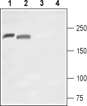 Western blot analysis of rat brain (lanes 1 and 3) and rat DRG (lanes 2 and 4) lysates:1,2. Anti-NaV1.8 (SCN10A) (extracellular) Antibody (#ASC-028), (1:200).