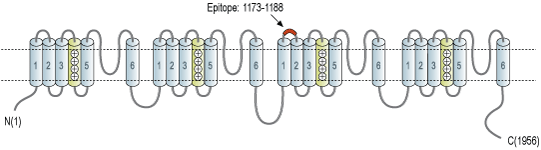- Peptide (C)EDNYLEEKPRVKSVLE, corresponding to amino acid residues 1173-1188 of rat NaV1.8 (Accession Q62968). 1st extracellular loop, domain III.
