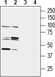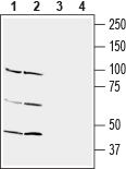 Western blot analysis of mouse (lanes 1 and 3) and rat (lanes 2 and 4) testis membranes:1,2. Anti-Nectin-3/PVRL3 (extracellular) Antibody (#ANR-053), (1:200).