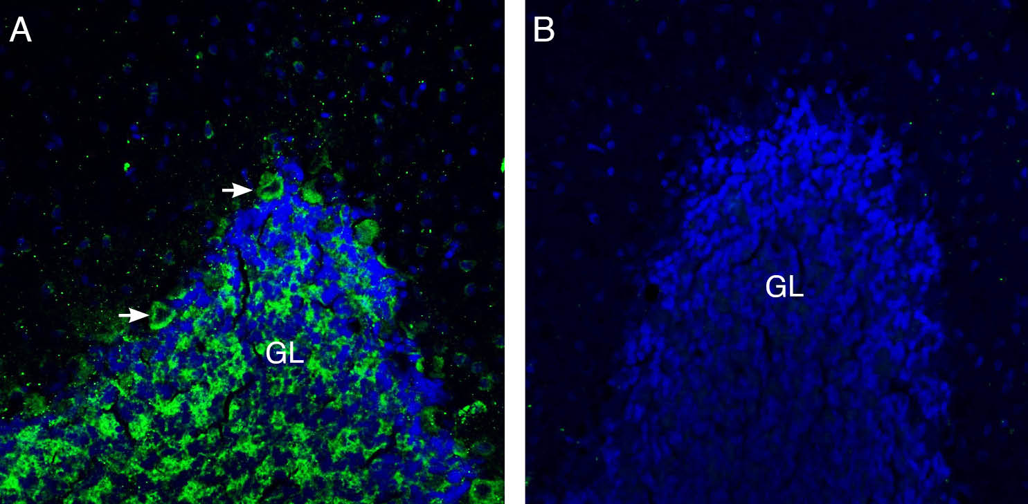 Expression of Neuroligin-3 in rat cerebellum.Immunohistochemical staining of perfusion-fixed frozen rat brain sections with Anti-Neuroligin 3 (extracellular) Antibody (#ANR-037), (1:200), followed by goat anti-rabbit-AlexaFluor-488. A. Neuroligin-3 immunoreactivity (green) appears in in the granule layer (GL) and in some purkinje cells (arrows). B. Pre-incubation of the antibody with Neuroligin 3 (extracellular) Blocking Peptide (BLP-NR037), suppressed staining. Cell nuclei are stained with DAPI (blue).