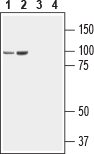 Western blot analysis of rat (lanes 1 and 3) and mouse (lanes 2 and 4) brain lysate:1,2. Anti-Neuroligin 3 (extracellular) Antibody (#ANR-037), (1:200).