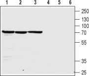 Western blot analysis of SH-SY5Y human neuroblastoma cell lysate (lanes 1 and 4), rat dorsal root ganglion (lanes 2 and 5) and mouse brain (lanes 3 and 6) lysates:1-3. Anti-Nicotinic Acetylcholine Receptor β4 (CHRNB4) (extracellular) Antibody (#ANC-014), (1:200).