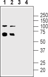 Western blot analysis of rat (lanes 1 and 3) and mouse (lanes 2 and 4) enriched brain membranes:1,2. Anti-Nicotinic Acetylcholine Receptor α5 (CHRNA5) (extracellular) Antibody (#ANC-005), (1:200).