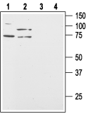 Western blot analysis of rat (lanes 1 and 3) and mouse (lanes 2 and 4) brain lysates:1,2. Anti-Orexin Receptor 2 Antibody (#AOR-002), (1:400).