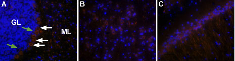 Expression of OX2R in rat brainImmunohistochemical staining of rat brain using Anti-Orexin Receptor 2 Antibody (#AOR-002), (1:50), followed by goat anti-rabbit-AlexaFluor-555 secondary antibody (1:500), (red). A. In the cerebellum, staining is present in cell bodies of both Golgi type I (Purkinje cells – white arrows) and Golgi type II (green arrows) neurons. Staining is also present in fibers in the molecular layer (ML). B. In the parietal cortex, staining is evident in neural cell bodies. C. In the hippocampus, staining is present in pyramidal cells in the CA1 layer. Note that both cell bodies and prolongations are stained. Hoechst 33342 is used as the counterstain (blue).