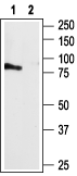 Western blot analysis of rat brain membranes:1. Anti-P2Y4 Receptor Antibody (#APR-006), (1:300).