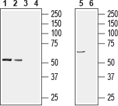 Western blot analysis of rat brain (lanes 1 and 3), mouse brain (lanes 2 and 4), (1:200) and human brain neuroblastoma SH-SY5Y cell line lysates (lanes 5 and 6), (1:600):1, 2, 5. Anti-PACSIN1 Antibody (#AIP-023).