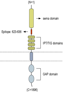 - Peptide (C)REVAPITRGQGDQR, corresponding to amino acid residues 623-636 of human PLXNA1 (Accession Q9UIW2). Extracellular, N-terminus.