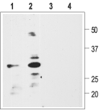 Western blot analysis of rat glioma C6 (1, 3) or human neuroblastoma SH-SY5Y (2, 4) cell lysate:1,2. Anti-proBDNF Antibody (#ANT-006), (1:200).