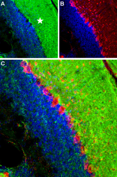 Expression of RyR1 in mouse cerebellumImmunohistochemical staining of mouse cerebellum frozen sections using Anti-Ryanodine Receptor 1 Antibody (#ARR-001), (1:100), (green). A. The highest expression of RyR1 is in the molecular layer (asterisk). B. In the same section, there is staining for parvalbumin (red), a marker of Purkinje cells. C. Merged image of panels A and B demonstrates that RyR1 is localized surrounding the dendritic tree of Purkinje cells. DAPI is used as the counterstain.