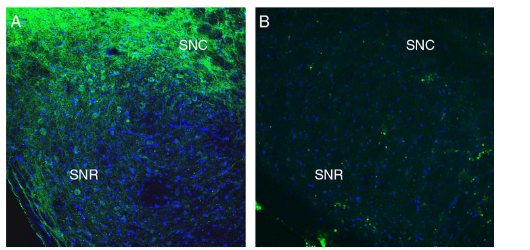 Expression of SLC41A2 in mouse midbrain.Immunohistochemical staining of perfusion-fixed frozen mouse brain sections with Anti-SLC41A2 (extracellular) Antibody (#ANT-146), (1:200), followed by goat anti-rabbit-AlexaFluor-488. A. Staining in the substantia nigra region, showed SLC41A2 immunoreactivity (green) in the substantia nigra pars compacta (SNC). B. Pre-incubation of the antibody with SLC41A2 (extracellular) Blocking Peptide (BLP-NT146), suppressed staining. Cell nuclei are stained with DAPI (blue). SNR = substantia nigra pars reticulata.