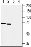 Western blot analysis of rat brain (lanes 1 and 3) and mouse brain (lanes 2 and 4) membranes:1, 2. Anti-SLC41A2 (extracellular) Antibody (#ANT-146), (1:2000).