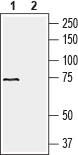 Western blot analysis of human liver carcinoma HepG2 cell line lysate (lanes 1 and 2):1. Anti-SLC41A2 (extracellular) Antibody (#ANT-146), (1:1000).