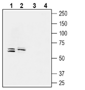 Western blot analysis of human LoVo colorectal adenocarcinoma cell line lysate (lanes 1 and 3) and human ARPE-19 retinal pigmented epithelium cell line lysate (2 and 4):1-2. Anti-SMCT1 (SLC5A8) Antibody (#AGT-036), (1:200). 3-4. Anti-SMCT1 (SLC5A8) Antibody, preincubated with SMCT1 (SLC5A8) Blocking Peptide (BLP-GT036).