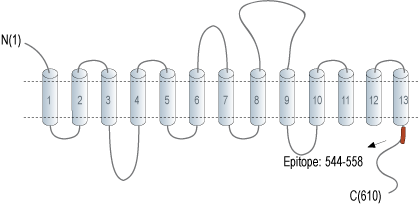 - Peptide (C)GGRKQNLDPRYILTK, corresponding to amino acid residues 544 - 558 of human SMCT1 (Accession Q8N695). Intracellular, C-terminus.