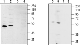 Western blot analysis of rat kidney (lanes 1 and 3), rat heart (lanes 2 and 4), human SH-SY5Y brain neuroblastoma (lanes 5 and 7) and Human MS-1 neuroendocrine skin carcinoma cell (lanes 6 and 8) lysates:1,2,5,6. Anti-S1PR2 (EDG5) Antibody (#ASR-012), (1:200).
