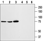 Western blot analysis of rat RBL basophilic leukemia (lanes 1 and 4), human HL-60 promyelocytic leukemia (lanes 2 and 5), and human Jurkat T-cell leukemia (lanes 3 and 6) cell lysates:1,2,3. Anti-STIM1 (extracellular) Antibody (#ACC-063), (1:1000).
