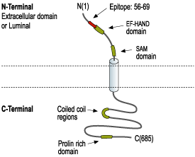 - Peptide CHSEDEKLSFEAVR, corresponding to amino acid residues 56-69 of human STIM1 (Accession Q13586). STIM1 expressed on the plasma membrane: Extracellular, N-terminus. STIM1 expressed on the ER: Luminal, N-terminus.