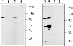 Western blot analysis of rat lung membrane (lanes 1 and 2), rat testes (lanes 3 and 4), mouse ms1 pancreas cells (lanes 5 and 7) and human LNCaP prostate cell (lanes 6 and 8) lysates:1,3,5,6. Anti-TRPM5 Antibody (#ACC-045), (1:200).