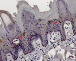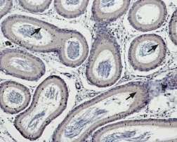 Expression of TRPM5 in rat testesImmunohistochemical staining of rat epididymis paraffin embedded sections using Anti-TRPM5 Antibody (#ACC-045), (1:100). TRPM5 is expressed in principal cells within the epididymal epithelium (arrows). Hematoxilin is used as the counterstain.