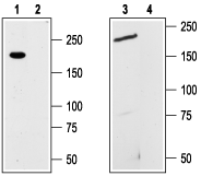 Western blot analysis of rat GH3 pituitary tumor cell line (lanes 1 and 2) and mouse brain (lanes 3 and 4) lysates:1,3. Anti-TRPM7 Antibody (#ACC-047), (1:200).
